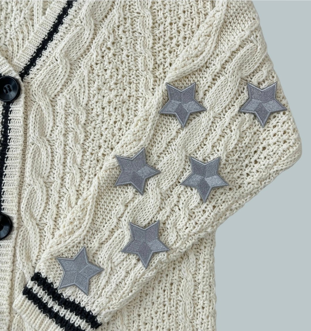 The DIY Star Patch Cardigan is a plain classic cardigan with 7 star patches (one spare star) to place anywhere as you please. Simply apply heat to attach the patches onto your knit.