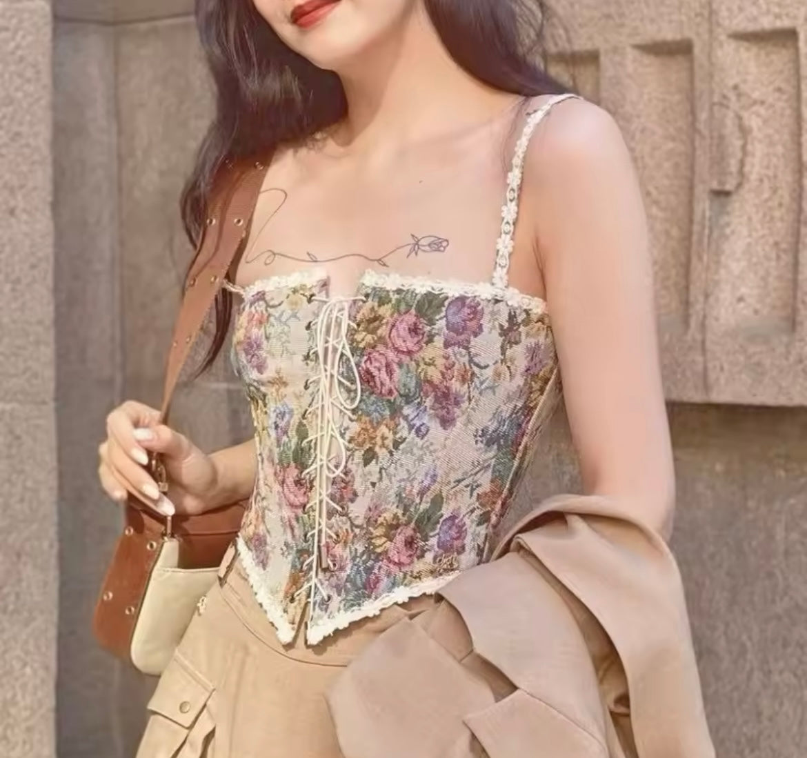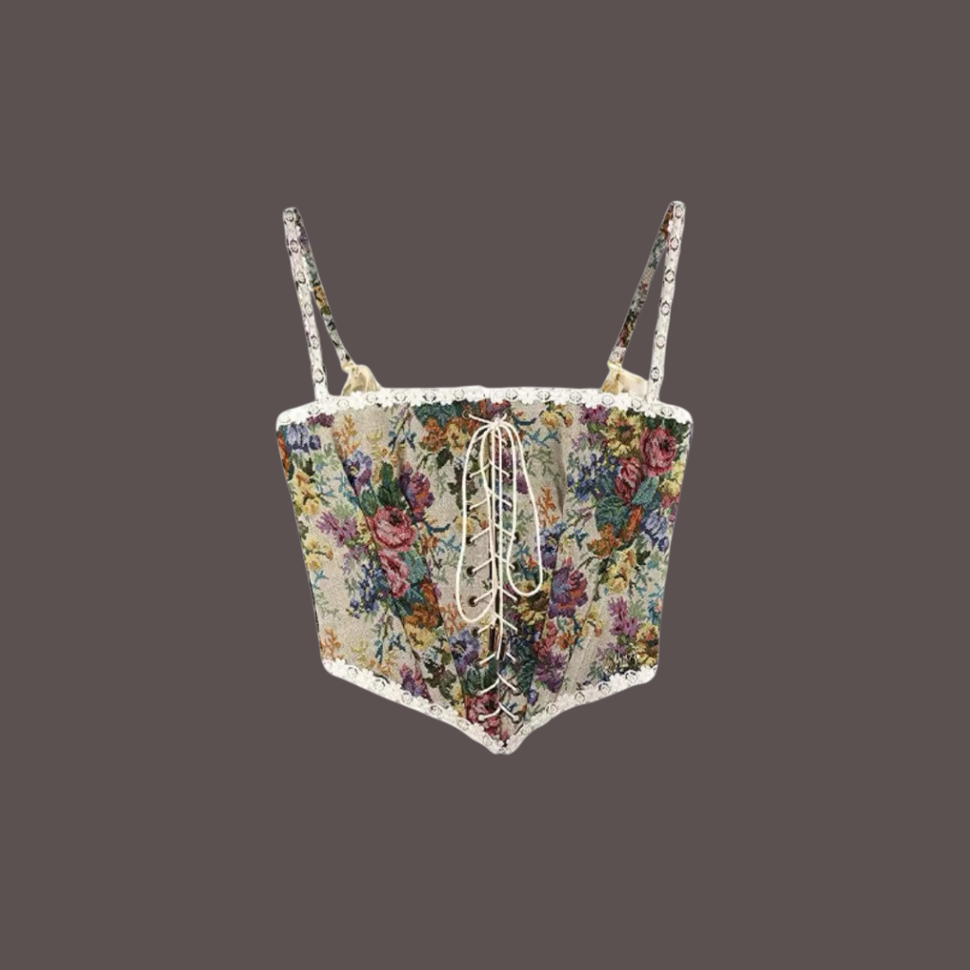 You can never have enough flowers in your Eras era! The Eras Corset made to pair with your floral Eras Cardigan features a vibrant array of flowers bordered by lace and pulled together with simple yet elegant criss-cross strings. The corset can be worn on its own as well as on top of a blouse.