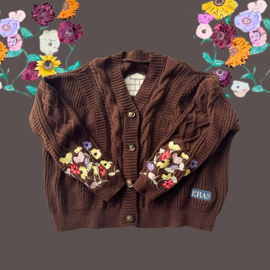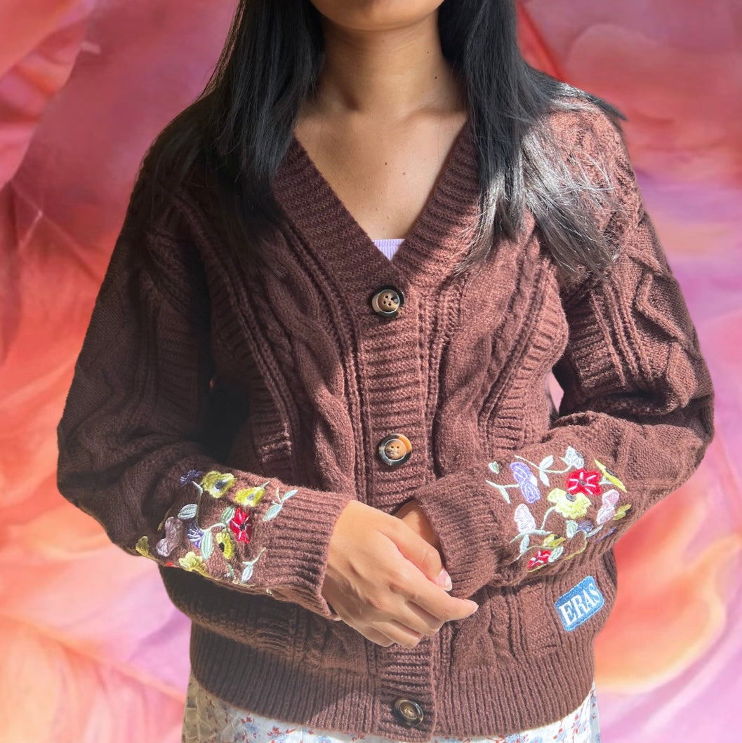Step into your poetic era with this rich brown cardigan, adorned with delicate floral embroidery down the sleeves - an homage to a certain grand piano that stole hearts under stadium lights. With its earthy tones and soft, nostalgic details, this piece echoes the beauty of songs that span decades and speak straight to the soul.