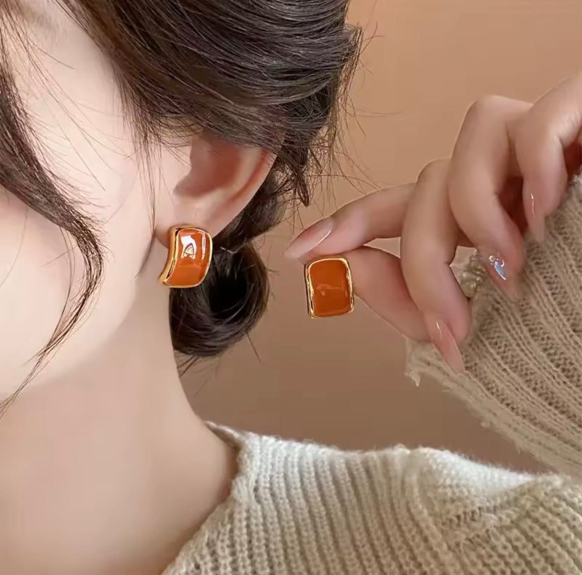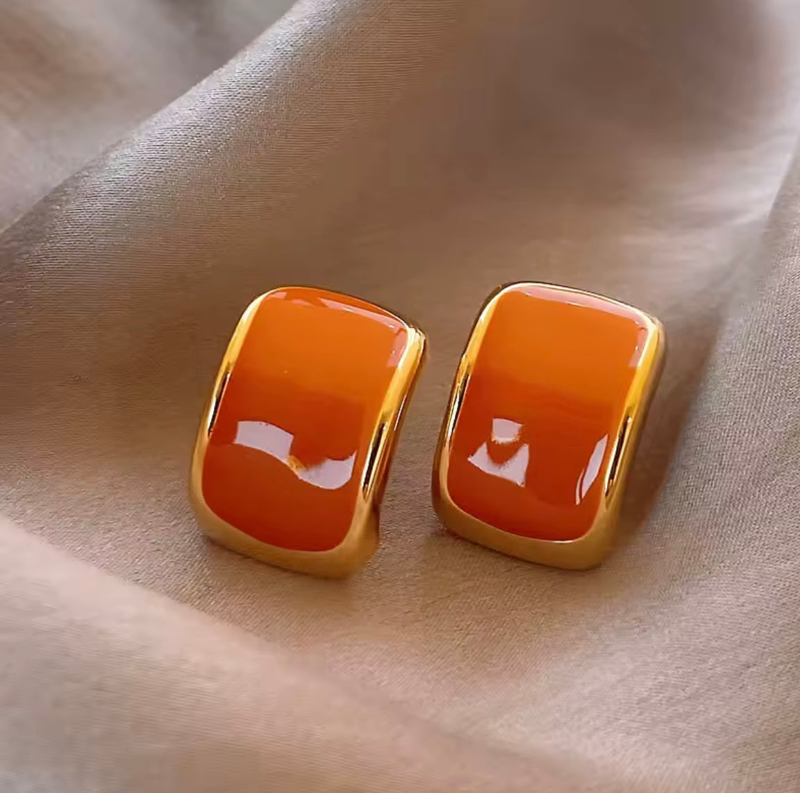 Framed in radiant gold, these orange rectangular earrings are the staples of autumn jewellery.