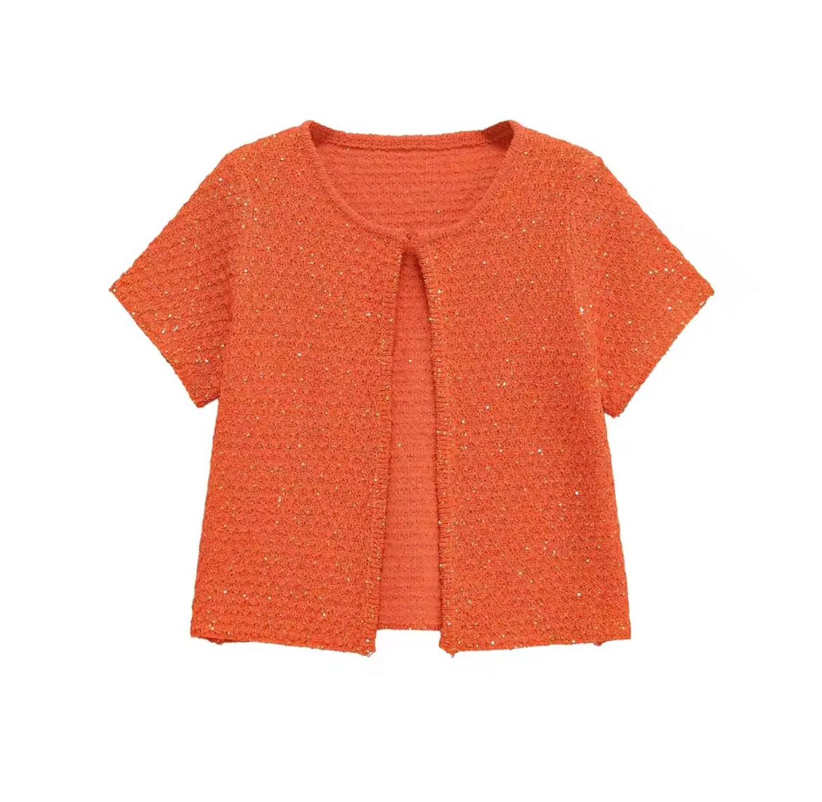 Stitched with orange sequins and designed with short sleeves, a classic round neckline, and a sleek, vintage buttonless front, Ophelia offers a shimmery, streamlined silhouette.