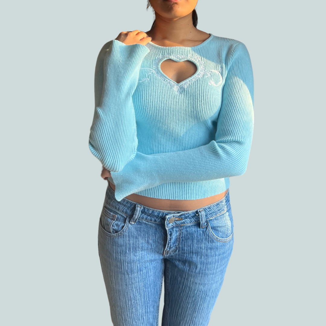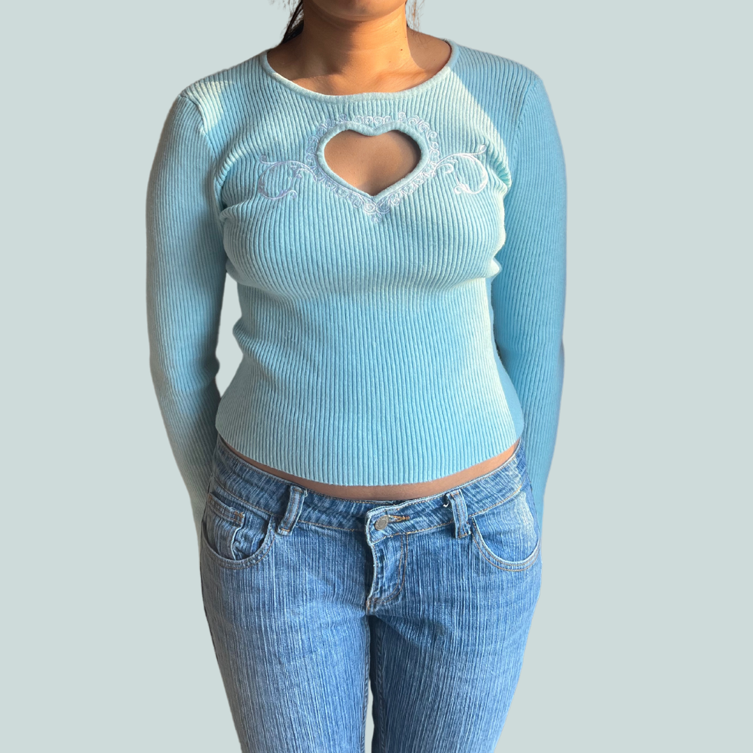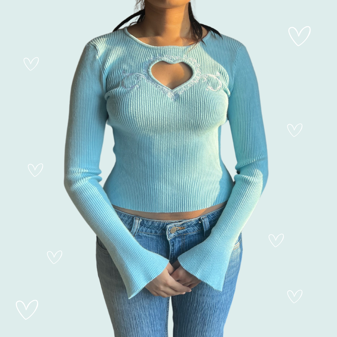 Sabrina’s Sweater in pastel blue! Made with special attention to texture this brand new knit by Ari Embroidery Studio features a ribbed knitting pattern that is guaranteed to feel as smooth as velvet against your skin. With a heart-cut out chest and intricate embroidery designs bordering the cut out, Sabrina’s Sweater is designed to keep you warm *and* stylish.