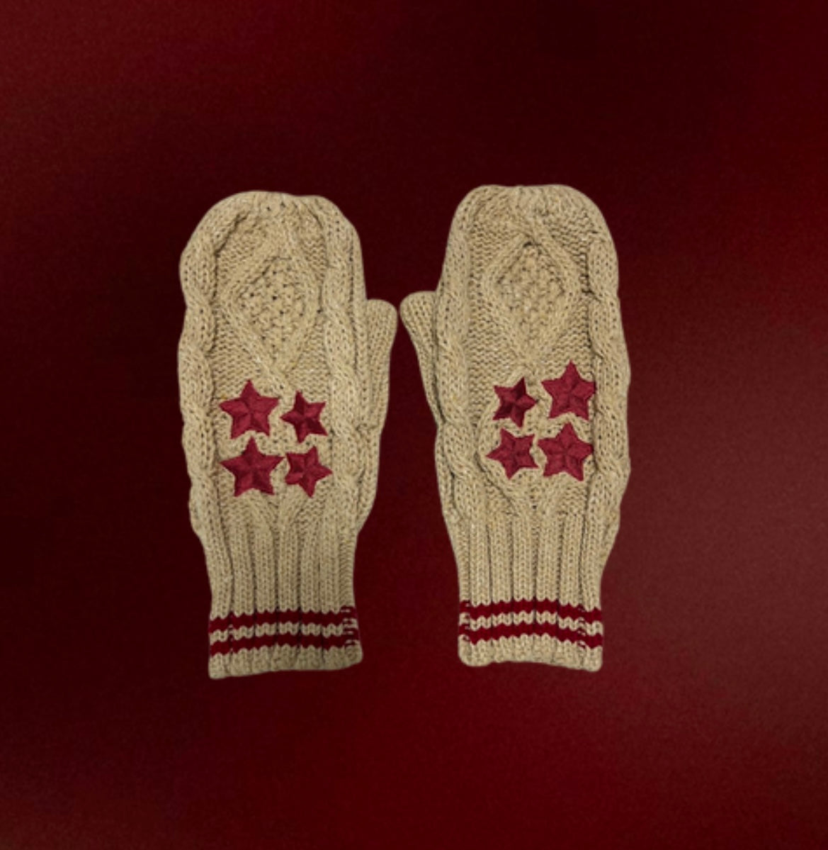 Keep warm in our brand new knitted accessory, a pair of cozy, knitted mittens featuring embroidered 3 star patches reminiscent of the RED holiday cardigan.