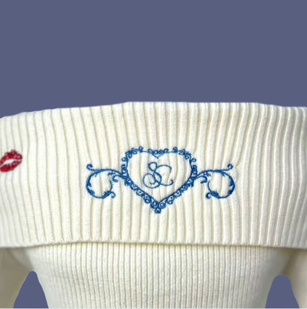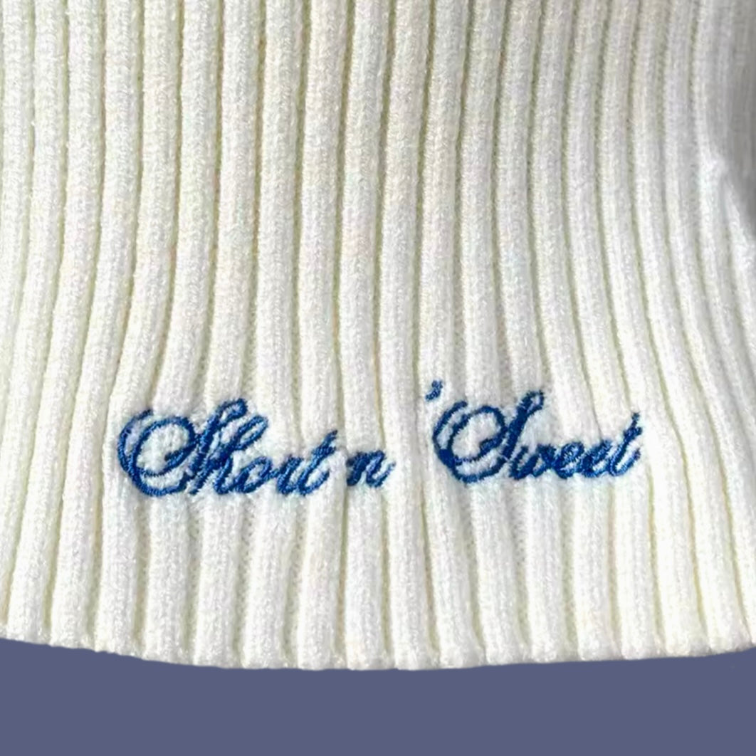 The front is adorned with coquette-style bows flowing over the collars and ‘Sweet n’ Short’ embroidered on the wearer’s bottom left. The back of the cardigan features an embroidered kiss print on the shoulder, and Sabrina’s gorgeous logo on the centre. And the best part? The girlies won’t have to worry about the embroidery itching on the back, as it is done in the outer part of the cardi! The sleeves are designed long and flared for that classic coquette vibe, with a small slit on the end for free hand movement, and the length will sit just below the belly button.