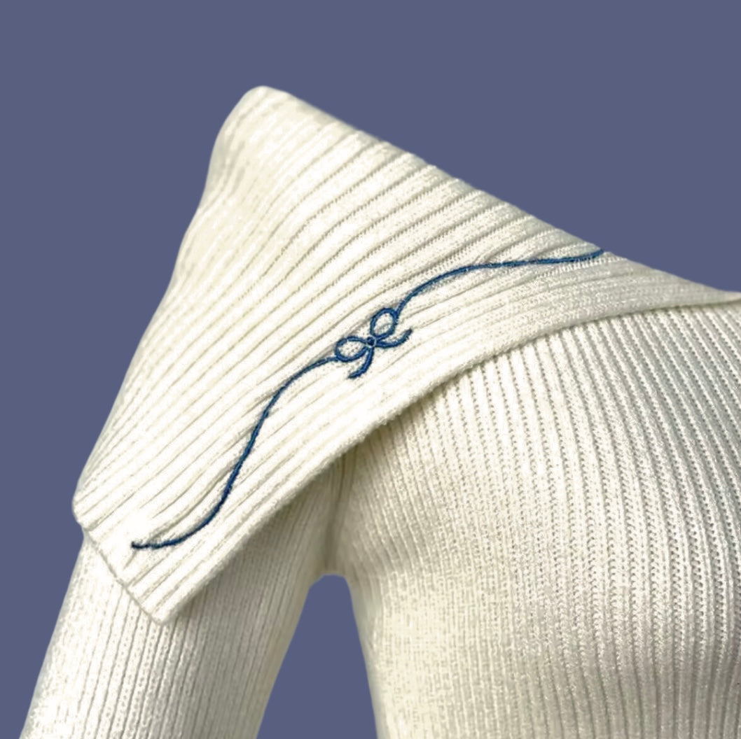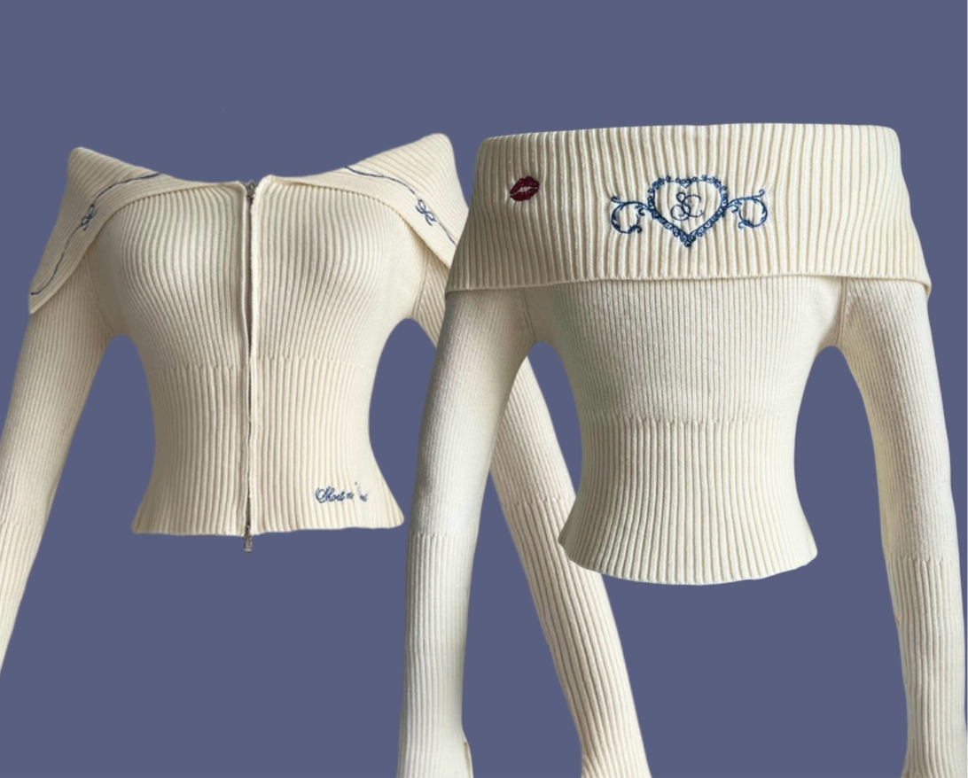 Sabrina’s sweater! Our first ever off-the-shoulder, zipper cardigan!